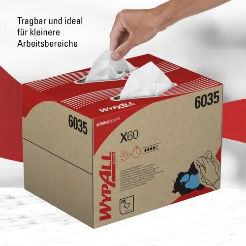 Das WypAll X60-Sortiment wurde speziell als ein leichtes, langlebiges Tuch für die Bewältigung verschiedener leichter Wischvorgänge entwickelt. Als Marktführer in Sachen Vielseitigkeit möchten wir Sie dabei unterstützen, Ihre Produktivität und Effizienz zu steigern – und zugleich Abfall zu reduzieren, indem wir ein sauberes und wiederverwendbares Tuch anbieten, auf dessen Leistung Sie sich jederzeit verlassen können. Durch die fortgeschrittene Hydroknit™-Technologie ist jedes Tuch leicht und doch saugfähig – für weniger Rückstände und vielseitiges Reinigen bei einer Vielzahl von Aufgaben. Das Tuch ist perfekt für den Einsatz in der industriellen Fertigung und entfernt ideal Leichtöl, Klebstoffe und Ablagerungen. Ebenso eignet es sich für die Reinigung von Glas und glänzenden Oberflächen. Erhältlich in einem flexiblen BRAG Box-System, wodurch das Tuch vor dem Kontakt mit Schmutz und Dreck geschützt und die kontrollierte Abgabe einzelner Tücher möglich ist. Sie berühren nur das Tuch, das Sie benutzen – so kontrollieren Sie die Verwendung, reduzieren Abfall und haben Zugang zu geschützten Tüchern. Tragbar und ideal für kleine Arbeitsräume. Die Abmessungen eines Tuchs betragen 41,8 cm (L) x 28,3 cm (B).