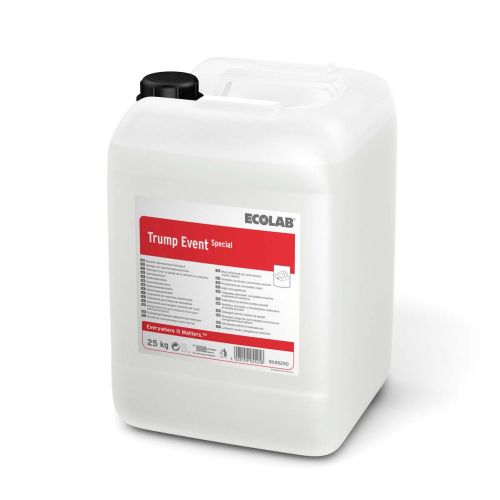 Trump Event Special ist ein hochkonzentriertes, flüssiges Maschinenspülmittel besonders zum Einsatz unter mittelharten Wasserbedingungen (bis 14 °d) für alle Geschirrarten. Es ist ein Teil des innovativen NTA-, EDTA-, phosphat- und chlorfreien Produktsortiments von Ecolab. Es wurde speziell im Hinblick auf die Einhaltung der Nachhaltigkeitsanforderungen ent wickelt, mit in no vativen Inhaltsstoffen, um die Wasserhärte zu binden.