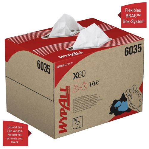Das WypAll X60-Sortiment wurde speziell als ein leichtes, langlebiges Tuch für die Bewältigung verschiedener leichter Wischvorgänge entwickelt. Als Marktführer in Sachen Vielseitigkeit möchten wir Sie dabei unterstützen, Ihre Produktivität und Effizienz zu steigern – und zugleich Abfall zu reduzieren, indem wir ein sauberes und wiederverwendbares Tuch anbieten, auf dessen Leistung Sie sich jederzeit verlassen können. Durch die fortgeschrittene Hydroknit™-Technologie ist jedes Tuch leicht und doch saugfähig – für weniger Rückstände und vielseitiges Reinigen bei einer Vielzahl von Aufgaben. Das Tuch ist perfekt für den Einsatz in der industriellen Fertigung und entfernt ideal Leichtöl, Klebstoffe und Ablagerungen. Ebenso eignet es sich für die Reinigung von Glas und glänzenden Oberflächen. Erhältlich in einem flexiblen BRAG Box-System, wodurch das Tuch vor dem Kontakt mit Schmutz und Dreck geschützt und die kontrollierte Abgabe einzelner Tücher möglich ist. Sie berühren nur das Tuch, das Sie benutzen – so kontrollieren Sie die Verwendung, reduzieren Abfall und haben Zugang zu geschützten Tüchern. Tragbar und ideal für kleine Arbeitsräume. Die Abmessungen eines Tuchs betragen 41,8 cm (L) x 28,3 cm (B).