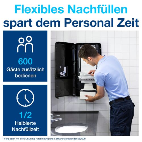 Tork PeakServe: die neueste Innovation für hochfrequentierte Waschräume, in denen das Reinigungspersonal mehr Reinigungsaufwand hat und für einen reibungslosen Besucherdurchlauf sorgen muss. Kompatibel mit dem Tork PeakServe® Endlos-Handtuchsystem. Das System verfügt über eine sehr hohe Kapazität von über 2.100 Handtüchern, die schnell und ohne Unterbrechung ausgegeben werden und so einen schnellen Besucherstrom ermöglichen. Die komprimierten Nachfüllungen sind schnell einzulegen, können jederzeit aufgefüllt werden und sind einfach und bequem zu transportieren und zu lagern – damit sich Ihr Personal ganz auf das Reinigen konzentrieren kann.