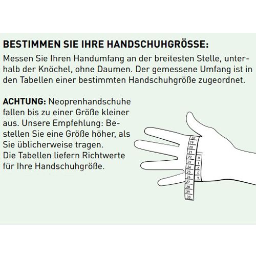 Unsere Empfehlung: Bestellen Sie eine Größe höher, als Sie üblicherweise tragen. Die Tabellen liefern Richtwerte für Ihre Handschuhgröße (siehe Produktbild).
